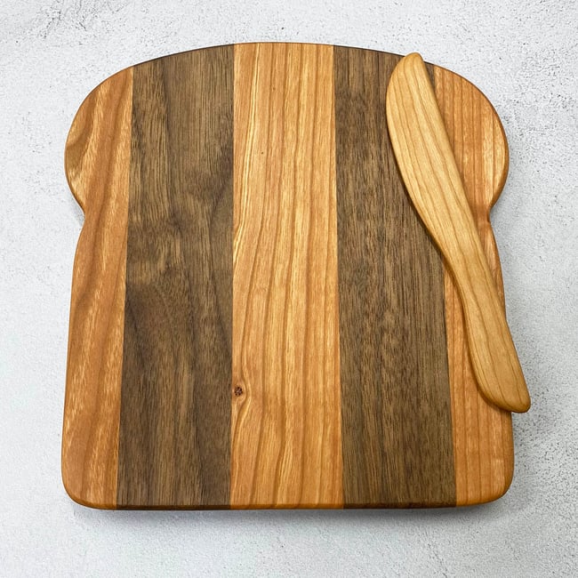 This bread-shaped board is made out of cherry and walnut, and measures approximately 10" by 8.25". It's just under 1" thick. Cherry spreading knife is included!
