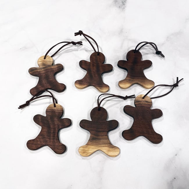 These gingerbread ornaments are made of curly black walnut, with no stains or dyes. Each ornament is tied with leather cording and comes with a cloth bag for storage.